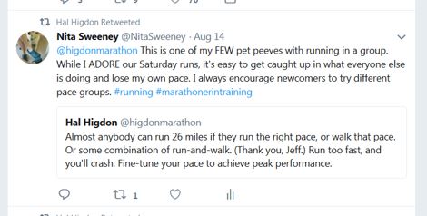 Then, something remarkable happened. One of my running heroes, Hal Higdon, retweeted one of my replies to his tweet!