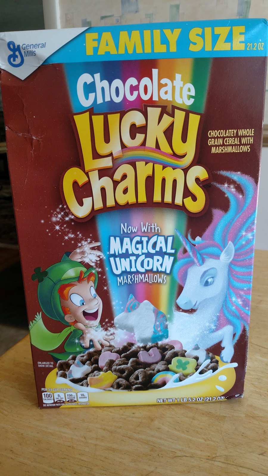 Hubby brought home this ginormous box of chocolate Lucky Charms with magical unicorn marshmallows. He knows I adore unicorns. I hope it lasts the weekend.